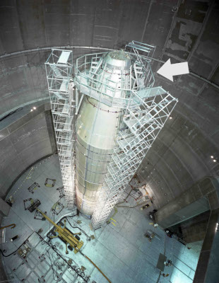 The stile rests atop three scaffolding towers and provides elevated access to the upper joints of a payload fairing as it narrows toward the nose. From this vantage point, engineers and technicians could assemble, inspect, and verify interfaces in one of the most sensitive areas of a launch vehicle stack.